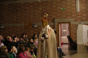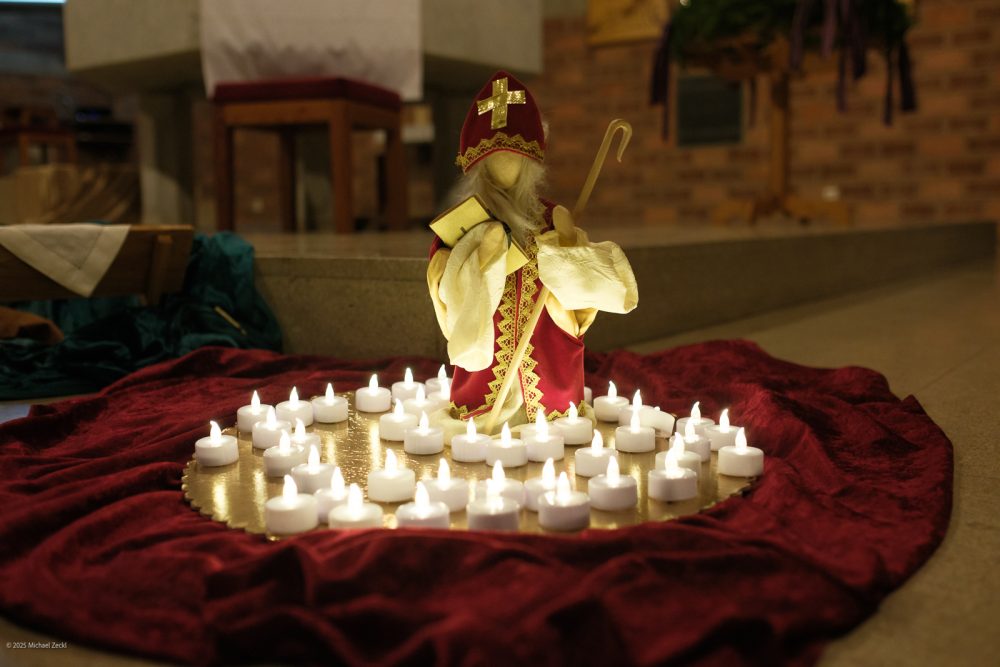 Zu Beginn entzündeten wir die Adventkranzkerze und sangen „Wir sagen euch an den lieben Advent“. Nach dem Kreuzzeichen hieß die Gemeinde alle herzlich willkommen und erinnerte daran, wie der heilige Nikolaus mit Güte und Mut vielen Menschen geholfen hat. Anschließend hörten wir eine Nikolauslegende.